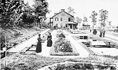 Rearing and Breeding Ponds at Cold Spring Harbor, showing Sunshades and Spawning Races for Large Ponds. By courtesy of Mr. W. H. Cooper, President of the Photo-Section, Brooklyn Institute.