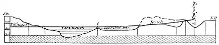 interruptions, for there is no intervening strand, as the water did not remain at one level long enough to leave beaches. Warren water was now broken up into two great gulfs; the one called the Algonquin, occupying the basins of Lakes Superior, Michigan, and Huron, and opening to the northeast, through the strait to the Ottawa Valley, as is shown on the map (Fig. 13); the other was the Lundy Gulf, occupying most of Erie basin, and extending over the Ontario Valley at a great height. In the region of Nipissing Strait the two gulfs united.