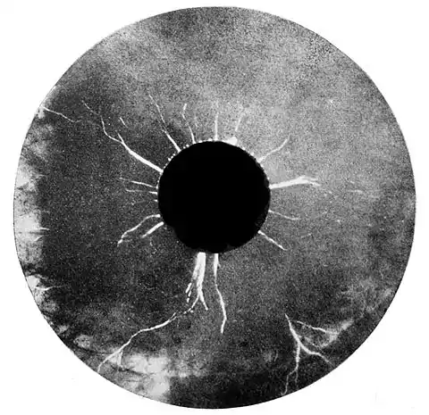 covered with a light brownish coating of lampblack. After the discharge a white track is found, as shown in the photographs. Both these pictures show evidence of the vortex motion of the
