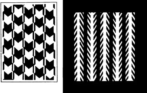 Fig. 5.—The black and white portions of this design are precisely alike, but the effect of looking at the figure as a pattern in black upon a white background, or as a pattern in white upon a black background, is quite different, although the difference is not easily described. | Fig. 6.—When this figure is viewed as a black pattern on a white background, the four main vertical lines seem far from parallel; when it is viewed as a white pattern on a black background this illusion disappears (or nearly so), and the black lines as well as the white ones seem parallel. |