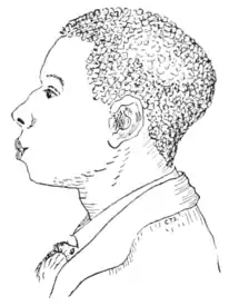 Fig. 14. The Long Head with Prognathous Face. Facial angle +15°. A glance at Fig 14 will show that the negro as he is known in our Southern States not only throws the head backward in the manner characteristic of the long head, the strong facial angle and the depressed visual plane, but that the eyebrows are characteristically elevated. This drawing up of the brow is accompanied with a drawing upon the lids and hence no pressure is brought upon the surface of the eyes by the upper lids. In the case of the tall head with the high plane of vision the brows are strongly compressed and the lids bind upon the eyeball and thus in the midst of dust and filth or even in good sanitary surroundings disease of the lids may be promoted. Reverting once more to the declinations of the retinal meridians, the same effect may be induced both as to the pose of the head and the relaxed state of the lids. It is, however, impracticable to consider the subject from that point of view at present.