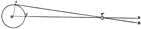 By the sun's horizontal parallax is meant that particular amount of change in its direction which would be noted by our two observers if they were half the diameter of the earth apart (as in Fig. 1, where the observer at A sees V in the direction A B, the one at C in the direction C D, and where the difference of these directions is A V C, the angle under which the earth's radius would be seen from V). At the