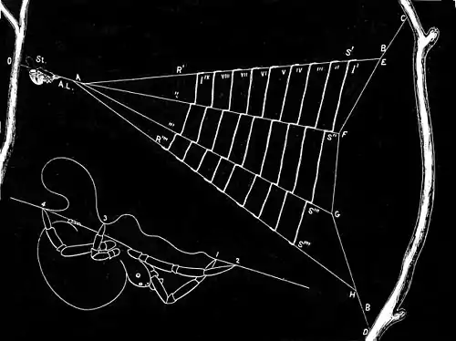 B B, the base-line attached, at C and D, to a hemlock-branch; E F G, points of attachment to the base-line of the three radii, R' to R", which converge at A, the apex of the net; I' to IIX, nine transverse or interradial double lines; S' to S', attachments of the first interradial upon the radii; A L, apex-line; O, origin of the apex-line from a second branch; Sl., loop of the apex-line or "slack," between the front and hinder feet of the spider: this is better shown in the lower enlarged figure.
