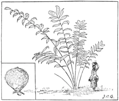 Certain species have trunks of uneven size, swollen here or there. These bellied palms, as they are called in Brazil, usually have the swollen part at some fixed place in the trunk. This is true of the paxiuba barriguda (Iriartea ventricosa) and of the Acrocomia, but at Assuncion, Paraguay, I found the swollen portions of the trunk of a palm locally called Bocadjá now near the base and now near the summit and another time near the middle. Some palm trunks are as smooth as if tooled, others, like the coco, are more or less ribbed. These ribs run round the trunk, and on some trees they are so close together that the whole trunk is notched with them. The ribs are really only leaf scars.