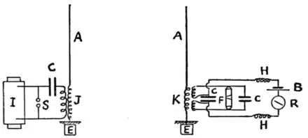 Fig. 23. Marconi Transmitter and Receiver. I, induction coil; A, aerial; E, earth plate; HH, choking coils; S, spark gap; J, transmitting jigger; K, receiving jigger; R, relay C, condenser; F, filings tube; B, battery. Many practical details are omitted.
