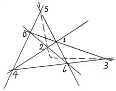 A set of four points, such as A, B, C, D, of which no three are collinear, when taken together with the lines (called the sides) joining the six pairs of points, AB, BC, CD, DA, AC, BD, is called a complete quadrangle. In the diagram below, the vertices of a complete quadrangle are 0, 1, 4, 6. The three additional points 2, 3, 5, in which the sides of the quadrangle intersect, are called the diagonal points.