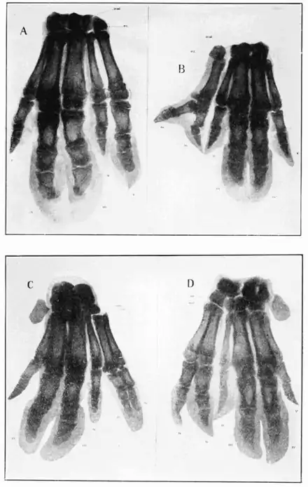Fig. 5. A series of four X-ray photographs showing variations and duplications of the pollex (I.) in the manus of the pig. A, a manus in which the pollex is represented by an abnormally large digit of three phalanges; B, the phalanges of the extra digit are duplicated: C, all the bones of the extra digit are duplicated, but both sets of phalanges are enclosed within a single hoof; D, two extra digits are present, articulating with a single trapezium (trz.).