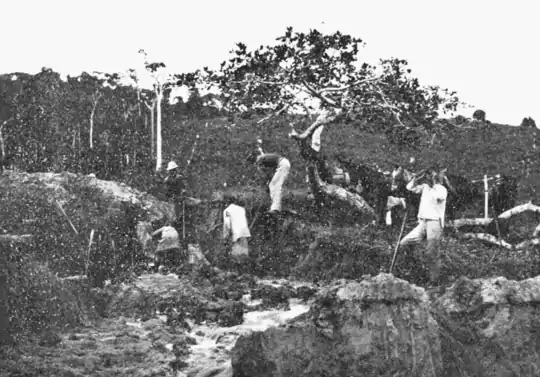cut into the rock. The diving can only be done when the river is low and is chiefly done naked, though there are a few diving suits in use. The naked divers descend a pole planted in the river and fill a sack with the cascalho, which is taken on shore for washing. The ability of some of these men to go to great depths and stay under for long intervals is extraordinary. In some places attempt is made to work the old river bed, but this is done with great difficulty, as water will seep in almost as fast it can be bailed out, leaving little time for the collection of cascalho.