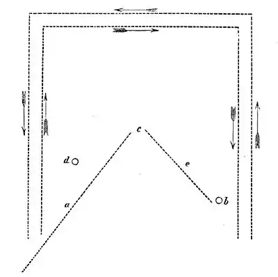 The line a of the sketch shows the path of this latter section, the mound of flowers and leaves being at c. This line leads to the shrubs, upon which another division of the black workers is settled, engaged in cutting off the leaves and petals to be conveyed to the nest. On the west side of the encampment is a hole marked d, leading to the interior of the nest. It is probably intended for the introduction of air, as, in case of any individuals carrying their loads into it, they immediately emerge and carry them to the common heap, as if conscious of having made a mistake. A smaller hole, near the southeast corner of the square, is the only other means by which the interior can be reached; and down this aperture, b, the flowers gathered by the black workers are carried along the line e from the heap in the centre of the square, by a number of the small yellow workers, who seem adapted for the gentler office of nurses for the colony within. No black ant is