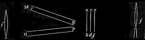 Two tin tubes (M N and O P, Fig. 3) with open ends are placed so as to form an acute angle with each other. At the end of one is the vibrating reed r, opposite the end of the other and in the prolongation of P O is the sensitive flame f, a second sensitive flame (f') being placed in the continuation of the axis of M N. On sounding the reed, the direct sound through M N agitates the flame f'. Introducing the square of calico a b at the proper angle, a slight decrease of the action on f' is noticed, and the feeble echo from a b produces a barely perceptible agitation of the flame f. Adding another square, c d, the sound transmitted by a b impinges on c d; it is partially echoed, returns through a b, passes along P O, and still further agitates the flame f. Adding a third square, e f, the reflected sound is still further augmented, every accession to the echo being accompanied by a corre-