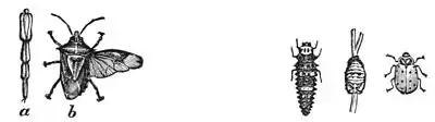 a, beak enlarged; b, perfect insect, with the wings expanded on one side. Color, ochreous. | Larva, pupa, and beetle. Colors, orange, white, and black. | |