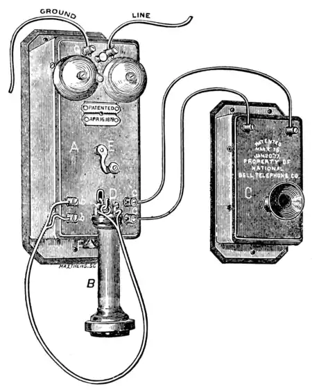 The next change came in the adoption of the first of the vertical boxes as a transmitter in connection with the magneto-call bell, and the use of the hand telephone as a receiver. In method of operation both instruments were identical, either could be used as transmitter or receiver, and both were fastened to the wall side by side (Fig. 26). The approved method of calling then in vogue is also shown (Fig. 27). The circular of instructions sent out with this early wall set read: