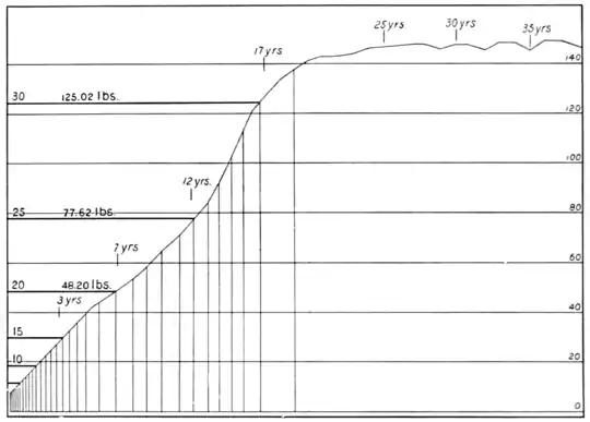 form of representation of this same phenomenon as it occurs in the human subject. Here is a diagram of growth, which represents, as accurately as I could determine it, the curve complete for man from the date of birth up to the age of forty years. It has been calculated by a simple mathematical process where these ten-per-cent. increments fall, and from each point in this curve where there has been such an increment, a vertical line has been drawn, as you see here. These lines are very close together at the start. One ten per cent, after another follows in a short interval of time, but gradually the time, as indicated by the space between two of these vertical lines, increases, and when the individual is three years old, you can see there has been a very great