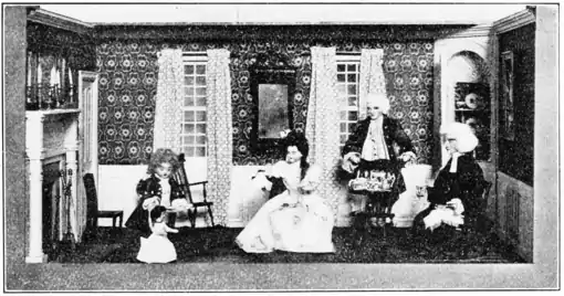 Model of a Parlor in a New England Home about 1750. The scene shows an afternoon call from the minister and the family assembled to receive him and serve afternoon tea and cake. The details of furniture, decorations, and costumes are historically accurate. In the History Room.