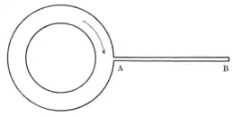 But to return to our subject, let us carry out some experiments to discover the nature of the stimulus which produces each pulsation of the jellyfish. If we cut a ring from the medusa's disk such as is shown in Fig. 3 and leaves a long narrow strip AB attached to it, and then Fig. 3. A Pulsating Ring with an "Index-strip." start a contraction-wave traveling e around the ring; every time the wave passes the point A a side-tracked portion of the wave will pass along the strip from A to B. When each sidetracked wave comes to the end B it dies out, for it can not return over the recently stimulated tissue along which it has just passed. Thus we see that the index strip AB simply serves to catch a portion of each wave which passes its base.