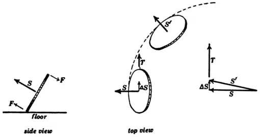 ΔS which, added to the existing spin-momentum S, gives the resultant spin-momentum S' in the direction of which the axis of the penny is found to be turned. The result is that the penny rolls along a circular path as represented by the dotted curve in the top view, Fig. 23. The wheels of a bicycle exhibit a gyrostatic reaction when