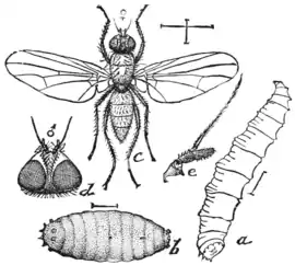 And there is yet another heading under which we have to consider insects in their effect upon man, and that is in the light of pests on the crops which are grown by him. A very large percentage of all insects are vegetable feeders and, naturally enough, when large areas are planted to one crop, so as to eliminate for the insect the problem of food supply, and cultural methods lessen their natural enemies, these vegetable feeders flourish out of all proportion to their normal natural limitations. The result is that a considerable percentage of the crop is destroyed, and most of the destroyed percentage represents the farmers' profit. That is to say, suppose it costs $5.00 to cultivate, plant, harvest and thresh an acre of wheat, and the harvest sets for a 15 bushel crop. With wheat Fig. 13. A root-maggot, a; its pupa, b; and the adult fly, c. at $1.00 per bushel at the station, the farmer might count on a profit of $10.00 per acre. But if in spring chinch-bug attack reduces the yield by 5 bushels, and the wheat-head army worm destroys 3 bushels more, the net return is reduced to $2.00 per acre, which is not living wage to the owner.