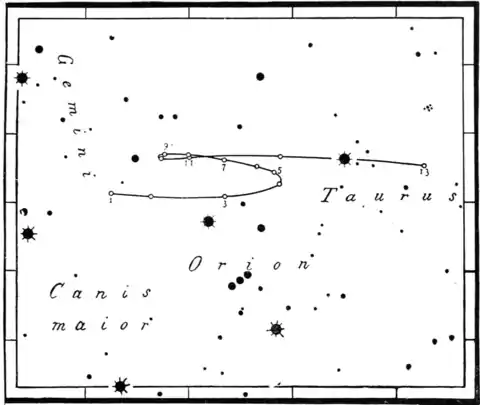 Apparent Orbit of Halley's Comet from October 2, 1908, to December 7, 1909. 1908 (1) Oct. 2, (2) Nov. 25. 1909 (3) Jan. 15, (4) March 3, (5) April 15, (6) May 25, (7) June 31, (8) Aug. 3, (9) Sept. 3. (10) Sept. 30, (11) Oct. 26, (12) Nov. 17, (13) Dec. 7.