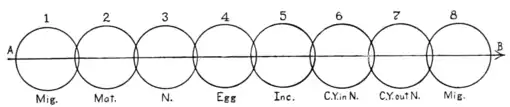 When the cyclical instincts rise and wane in their proper order, they may be represented by a series of circles tangent to each other, or with but little overlap (Fig. 15). Beginning at term 3 or 4, a cycle[1] is
