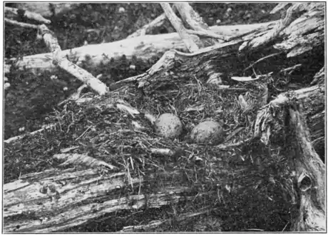Fig. 19. Gull's Nest on Rotten Log, with eggs starred and nearly ready to hatch, probably belonging to a bird which had earlier failed, but had renewed its activities in time to sucessfully rear young. July 20.