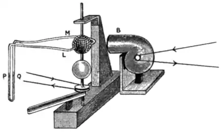 To show the difference between the smooth ball and the rough one, I bring the smooth ball opposite the blast; you observe the difference between the levels of the liquid in the two arms of the gauge. I now
