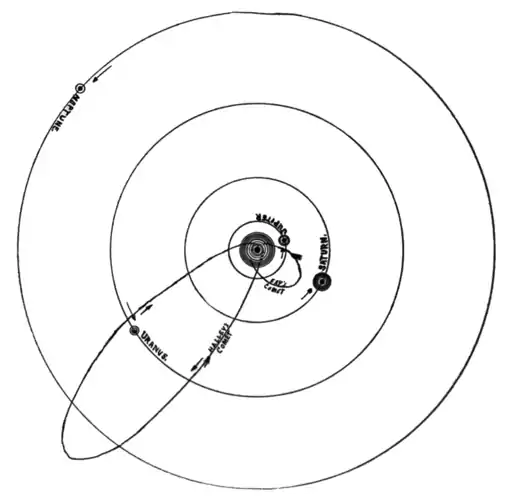 on the world-old problem, this riddle of the ages. What force holds that moon forever circling about the earth? An apple falls to the ground beside him and its thud awakens a train of thought in his mind. Can it be the same force in the two cases—is the moon but a larger apple forever falling toward the earth, urged by the force of gravity, and forever receding from the earth, urged by her own uniform motion? Fascinated by the thought, Newton sets to calculating. He has studied out the laws of uniform motion and of accelerated motion—now he combines the two and gets the law of circular motion. He draws a