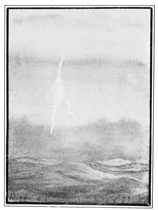 Fig. 7. Daylight Train of a Detonating Meteor. Seen from the Lick Observatory, 7:30 p. m., July 26, 1896, visible for one half hour, from a drawing published by the observatory. The enlarged part of the train is the point where the explosion occurred, twenty-eight miles above the surface of the earth.