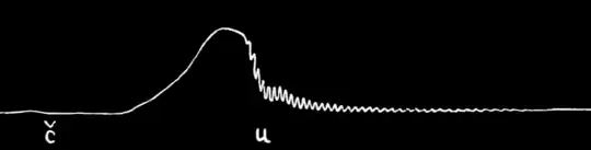 descent of the line after "u" indicates that this sound was cut short by some closure in the mouth, namely, by the tongue action for the sound "c." The line, however, does not remain at zero, but rises gradually; this indicates a steady emission of breath and not a complete closure. The partial closure is finally released and the explosion is registered in the sharp upward movement of the line. The sound "c" thus shows a sharp explosion like that of "t" but an incomplete closure. The closure is much greater than that of "sh" and the emission of air is much smaller (Fig. 4). The Italian soft "c" is therefore not an explosive occlusive like "t" or even like English "ch"; it is not a fricative like "sh"; it might be termed a fricative with an explosion. At any rate it is a distinct sound not existing in English.