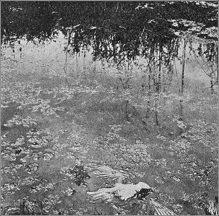 A Ground Owl that Mistook a Rancho La Brea Pool of Tar for Water. Vegetation on bank reflected in pool. Copyright 1909 by J. Z. Gilbert and F. C. Winter and reproduced by their permission.