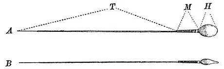 Fig. 2. Two Human Spermatozoa. A, showing the surface of the flattened head; B, its edge; H, head; M, middle piece; T, tail. (After G. Retzius.)