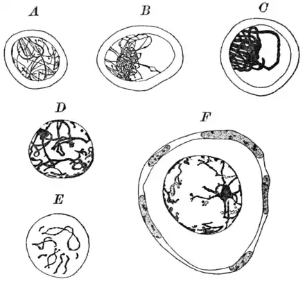 Fig. 33. Different Stages in the Development of the Egg of the Rabbit. A, at the beginning of the growth period showing slender chromatic threads in the nucleus; B, later stage in which these threads ball up and parallel threads conjugate forming the shorter, thicker thread shown in C; D and E, segmentation of the long thread into chromosomes (?) each of which shows its double nature; F, later stage in which the distinctions of the chromosomes is temporarily lost. (After Winiwarter.)