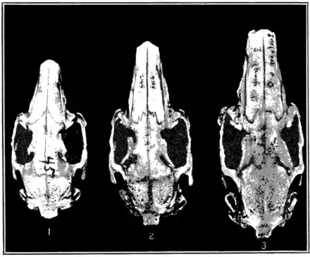 Fig. 65. Blending Inheritance of Size in Rabbits; the skulls of two parents are shown in 1 and 3, of their intermediate offspring in 2. (From Castle.)