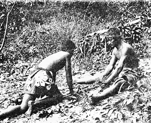 Making Fire in Tahiti, by rubbing two dried sticks of the yellow hibiscus one against the other.