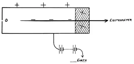 one centimeter from the opening O, where the alpha particles enter. If the outer brass tube be charged positively to about 1,000 volts, and the needle connected with a string electrometer, it is found that the entrance of an alpha particle produces a very great deflection of the fiber. So sensitive is this method, that Geiger has found that individual beta particles can easily be detected and counted by its aid. This is very remarkable when it is remembered that the ionization effect