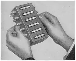 The "movie writer" as it is called, is exceedingly simple. Arthur F. Blanchard, of Cambridge, Mass., who is a Harvard graduate, is the inventor, and he believes his machine will revolutionize literary art. The device consists of a modest cardboard box six inches long, three inches wide and two inches deep. Half a dozen slots are cut in the top surface, beneath which revolve spools of paper upon which are printed several thousand scientifically selected words. Handles project from either side which are turned at will.