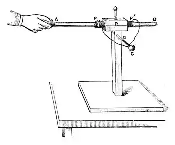 31. A B is the glass tube, clasped by the rubber, R. P P' are strips of metal furnished with rows of points. From P P' wires proceed to the knob C, which is insulated by the horizontal stem, G, from the stand of the machine. This insulating stem may be abolished with advantage, the wires from P and P' being rendered strong enough to support the ball C. At C sparks may be taken, a Leyden-jar charged, the electric mill turned, while wires carried from it may be employed in experiments on ignition.
