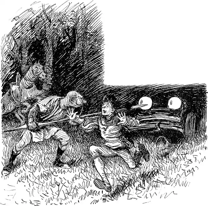 One evening, when wearied with toils of the chase— An evening of bright hunter’s moontime— Our hero drew rein in a still, woodsy place, Where fain would he rest him, and slumber a space, Having slain ninety monsters since noontime. His chestnut he tied to a horse-chestnut tree, (A natural bond of connection), Then, having his armor-canned body pried free, His limbs he outstretched, and with yawns, one, two, three, Set forward in Nodland’s direction; And soon, in rich baritone tones, Snored Sir Christopher Jenkinson Jones. |