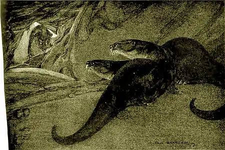 “It was astonishing how quickly the news got around that the old otters were gone. That evening, when the two unhappy youngsters stole back to the den, they found mink tracks almost at their very door. The hair bristled on their necks with fear and anger. But they dived into their empty cave, and, after whimpering lonesomely awhile, curled themselves up close together and went to sleep. It had been a strange and dreadful day.