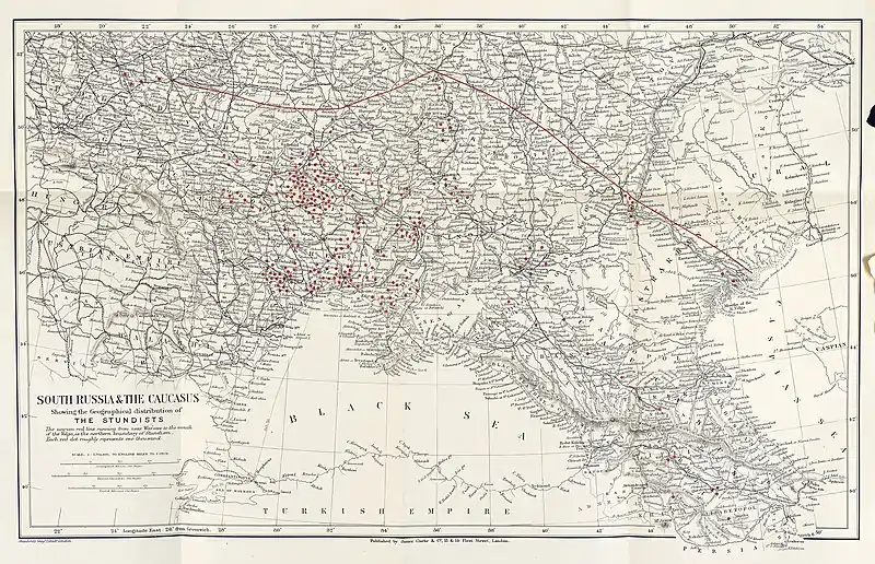 The uneven red line running from near Warsaw to the mouth of the Volga, is the northern boundary of Stundism.