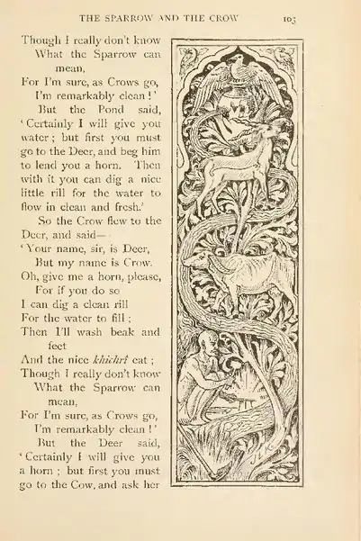 But the Pond said, ‘Certainly I will give you water; but first you must go to the Deer, and beg him to lend you a horn. Then with it you can dig a nice little rill for the water to flow in clean and fresh.’