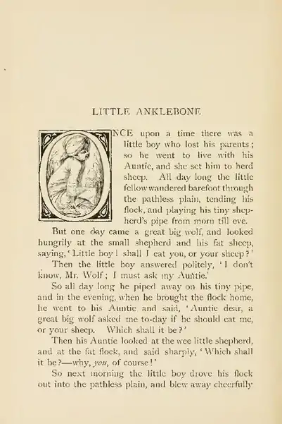 NCE upon a time there was a little boy who lost his parents; so he went to live with his Auntie, and she set him to herd sheep.All day long the little fellow wandered barefoot through the pathless plain, tending his flock, and playing his tiny shepherd's pipe from morn till eve.But one day came a great big wolf, and looked hungrily at the small shepherd and his fat sheep, saying, 'Little boy! shall I eat you, or your sheep?'