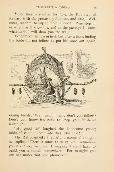 When they arrived at his hole, the Rat stepped forward with the greatest politeness and said, 'Welcome madam, to my humble abode! Pray step in, or if you will allow me, and as the passage is some what dark, I will show you the way.'