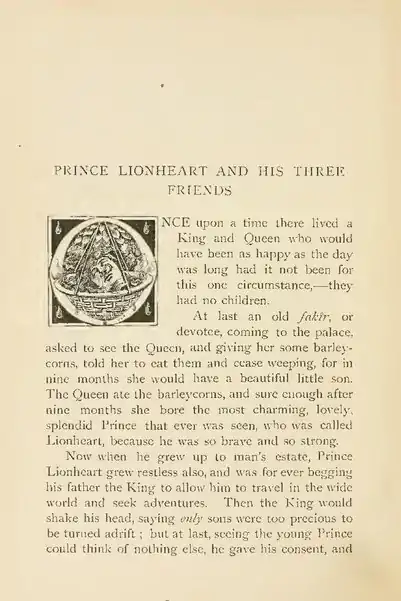 they had no children.At last an old fakîr, or devotee, coming to the palace, asked to see the Queen, and giving her some barleycorns, told her to eat them and cease weeping, for in nine months she would have a beautiful little son. The Queen ate the barleycorns, and sure enough after nine months she bore the most charming, lovely, splendid Prince that ever was seen, who was called Lionheart, because he was so brave and so strong.