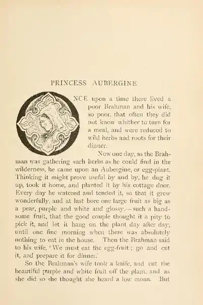 Now one day, as the Brahman was gathering such herbs as he could find in the wilderness, he came upon an Aubergine, or egg-plant. Thinking it might prove useful by and by, he dug it up, took it home, and planted it by his cottage door. Every day he watered and tended it, so that it grew wonderfully, and at last bore one large fruit as big as a pear, purple and white and glossy, such a handsome fruit, that the good couple thought it a pity to pick it, and let it hang on the plant day after day, until one fine morning when there was absolutely nothing to eat in the house. Then the Brahman said to his wife, 'We must eat the egg-fruit; go and cut it, and prepare it for dinner.'