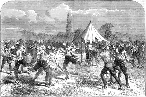 We conclude our notice of the game with an anecdote, from which it will be seen that it once was on the point of endangering the English rule in Canada. About the middle of the last century, after the conquest by Wolfe, the Indian chief Pontiac planned an attack on some of the principal forts, which was to be carried out by stratagem through the medium of "la crosse." The known skill of the Indians in the game frequently induced the officers of the garrison to invite them to play when they were in the locality, and occasionally some hundreds were engaged. Pontiac designed, on one of these occasions, that the ball should be struck, as if accidentally, into the forts, and that a few of the Indian party should enter after it. This was to be repeated two or three times, until suspicion was lulled, when they were to strike it over again, and rush in large numbers in pursuit. They were then to fall upon the garrison with concealed weapons. This ruse was carried into effect, and partially succeeded; but the Indians failed to enter the strongest of the fortifications, and were beaten back with much slaughter. Pontiac afterwards made friends with the English, but he was a treacherous ally, and it was a subject of congratulation when he was at last killed by one of his own race.