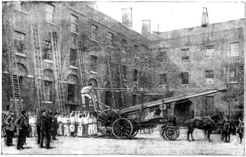 popular, for it seems somewhat of a trial to leap in cold blood into a sheet some twenty feet below. The feat of lifting a grown man (weighing perhaps sixteen stone) from the parapet to the right knee, then, by grasping the waist, getting the limp arm around his neck, and then, holding the leg, to rise up and walk on a narrow ledge amid all the terrible surroundings of a fire, requires much nerve and strength. Frequently we hear of deaths and injuries to men of the Brigade, but no landsman can attain proficiency in even double the time that sailors do—the latter are so accustomed to giddy heights, and to precarious footing.