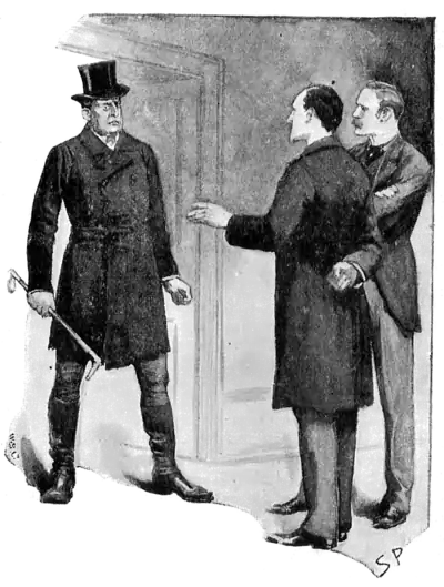 The ejaculation had been drawn from my companion by the fact that our door had been suddenly dashed open, and that a huge man had framed himself in the aperture. His costume was a peculiar mixture of the professional and of the agricultural, having a black top hat, a long frock coat, and a pair of high gaiters, with a hunting crop swinging in his hand. So tall was he that his hat actually brushed the cross bar of the doorway, and his breadth seemed to span it across from side to side. A large face, scared with a thousand wrinkles, burned yellow with the sun, and marked with every evil passion, was turned from one to the other of us, while his deep-set, bile-shot eyes, and his high thin fleshless nose, gave him somewhat the resemblance to a fierce old bird of prey.