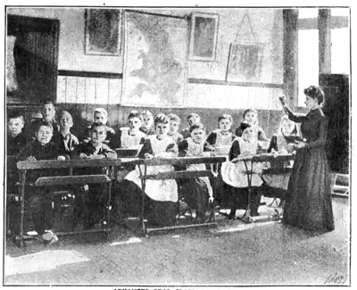 The next thing to be seen is an advanced oral class, made up of girls and boys of ages ranging from 12 to 13, They all rise respectfully as Dr. Elliott and I enter the room. They are in the midst of a lesson in writing from dictation, and, when they have resumed their seats, Dr. Elliott introduces me: "This is Mr. Salmon," he says, "who is going to write an article for The Strand Magazine on the Asylum." One or two pupils seemed to have missed what he said, but most of them smiled as they followed the words, and one boy said interrogatively, "Mr. Sammun?" The teacher then told them to write "Mr. Salmon." The majority spelt the name correctly: two spelt it "Sammon," and one "Simon." At Dr. Elliott's request I dictated a sentence. Every eye in the class was on the alert, as I said the first thing that occurred to me: "It is a very fine day." Pencils went to work with eager rapidity, and in a minute all slates were turned for my inspection. They all had the words right, except one or two who left out the "a." I said several other things, which were read from my lips without difficulty. Addressing a girl, the offspring of deaf and dumb parents, Dr. Elliott said:—