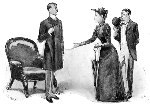 At the sight of these new-comers our client had sprung from his seat, and stood very erect, with his eyes cast down and his hand thrust into the breast of his frock coat, a picture of offended dignity. The lady had taken a quick step forward and had held out her hand to him, but he still refused