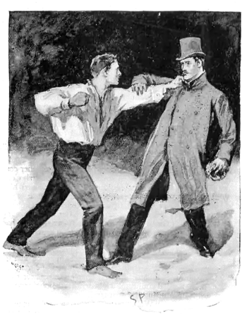 "ARTHUR CAUGHT HIM."Sir George Burnwell tried to get away, but Arthur caught him, and there was a struggle between them, your lad tugging at one side of the coronet, and his opponent at the other. In the scuffle, your son struck Sir George, and cut him over the eye. Then something suddenly snapped, and your son, finding that he had the coronet in his hands, rushed back, closed the window, ascended to your room, and had just observed that the coronet had been twisted in the struggle, and was endeavouring to straighten it, when you appeared upon the scene."